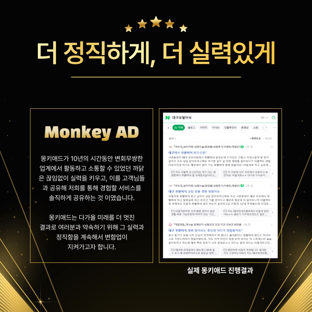 몽키애드가 약속하는 성과는 지루한 수치 나열이 아닌, 실제 귀사의 사업장에서 체감하는 유저들의 뜨거운 반응과 매출 전환의 지표로 나타납니다. 우리는 10년 최장수 기업의 자부심을 바탕으로, 귀사의 브랜드가 네이버 카페라는 생태계의 정점에서 업계를 선도하는 비즈니스 랜드마크로 우뚝 설 수 있도록 모든 역량을 투입하겠습니다. 실체가 없는 광고 문구가 아닌, 압도적인 결과물로 증명하는 네이버카페관리 업체 몽키애드와 함께 비즈니스의 새로운 성공 지도를 그려나가 보시기 바랍니다. 귀사의 비즈니스가 가질 수 있는 가장 날카로운 무기를 우리가 직접 제작하고 관리해 드리겠습니다.