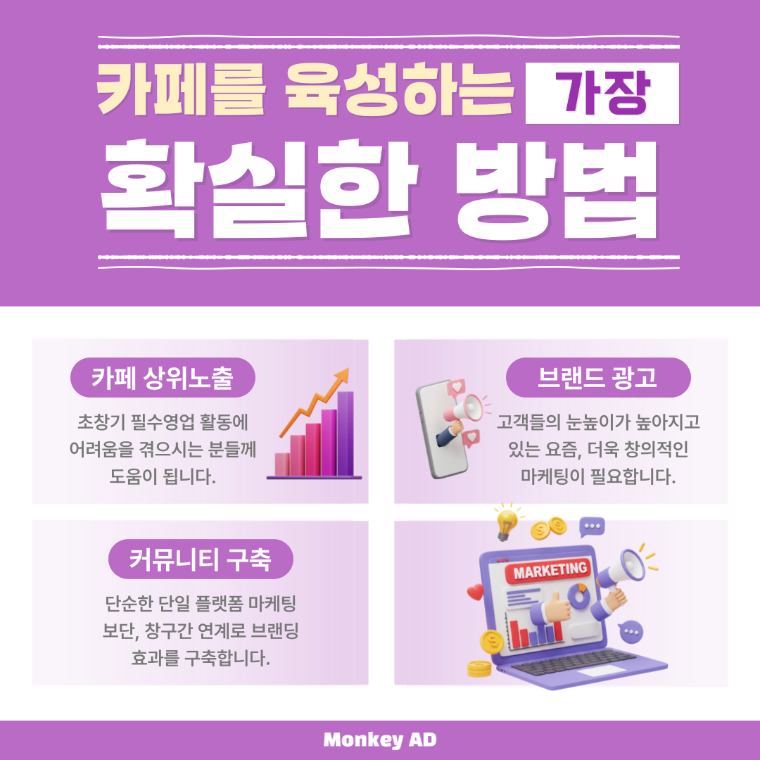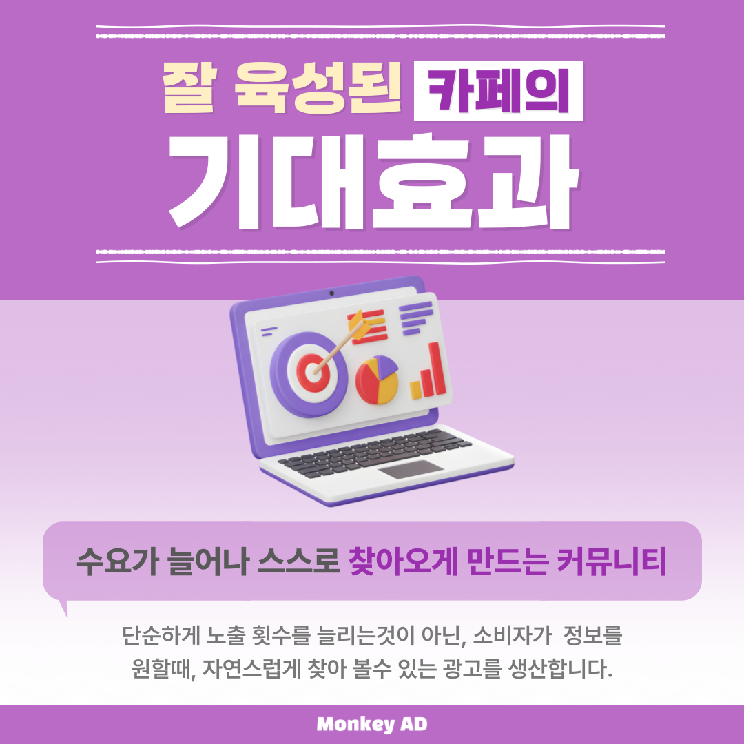 몽키애드는 단순한 업무 대행을 넘어 귀사의 비즈니스 자산을 유저의 언어로 세밀하게 번역하여 전달하는 전략적 파트너로서 함께합니다. 10년의 업력은 네이버 로직이 수백 번 변화하는 풍파를 정면으로 돌파하며 쌓아온 실전 대응 매뉴얼의 집약체입니다. 우리는 귀사의 카페를 단순한 관리 대상이 아니라 업계에서 독보적인 영향력을 행사하는 핵심 자산으로 구축하는 것을 목표로 삼습니다. 전문 인력들의 집요한 기획과 실행력이 더해진 커뮤니티는 시간이 흐를수록 그 가치가 증폭되며, 별도의 광고비 지출 없이도 지속적인 유입과 매출 전환을 발생시키는 강력한 수익 창출 기지로 작동할 것입니다.