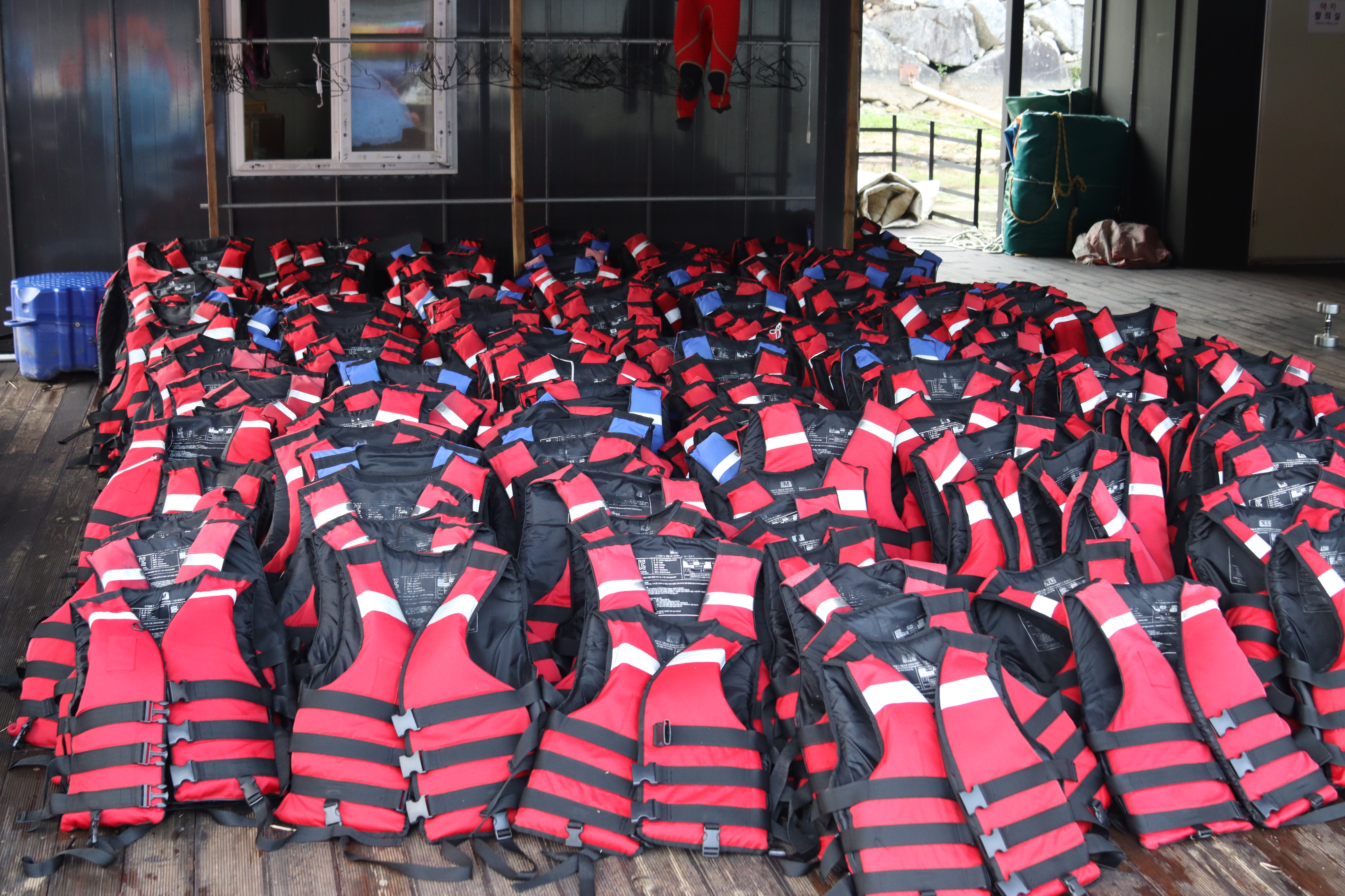 구명조끼 및 헤드기어도 충분한 수량으로 준비되어 있어 안전하게 수상레저를 즐기실 수 있는데요.